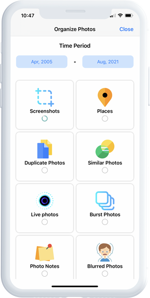 Search and delete useless photos, videos and contacts to freeup space. Hide your private photos, videos and contacts in a secret space.